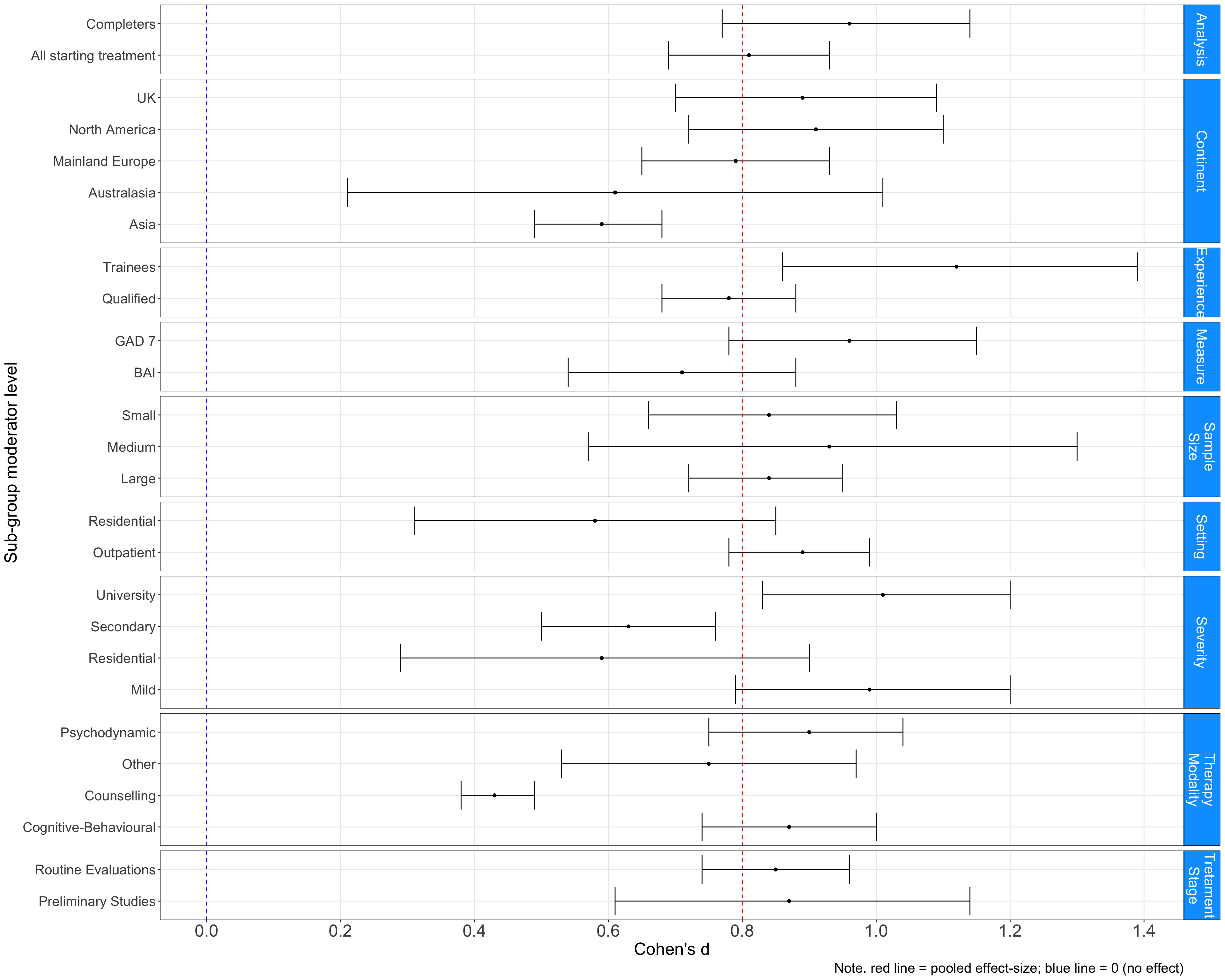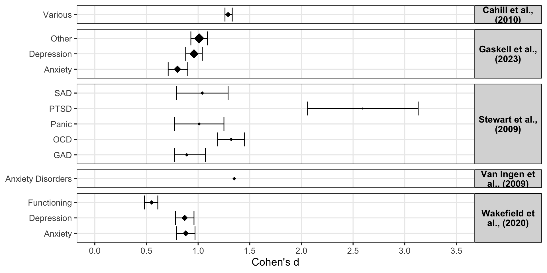 Anxiety: Mild samples had larger effect sizes than moderate or severe samples. |