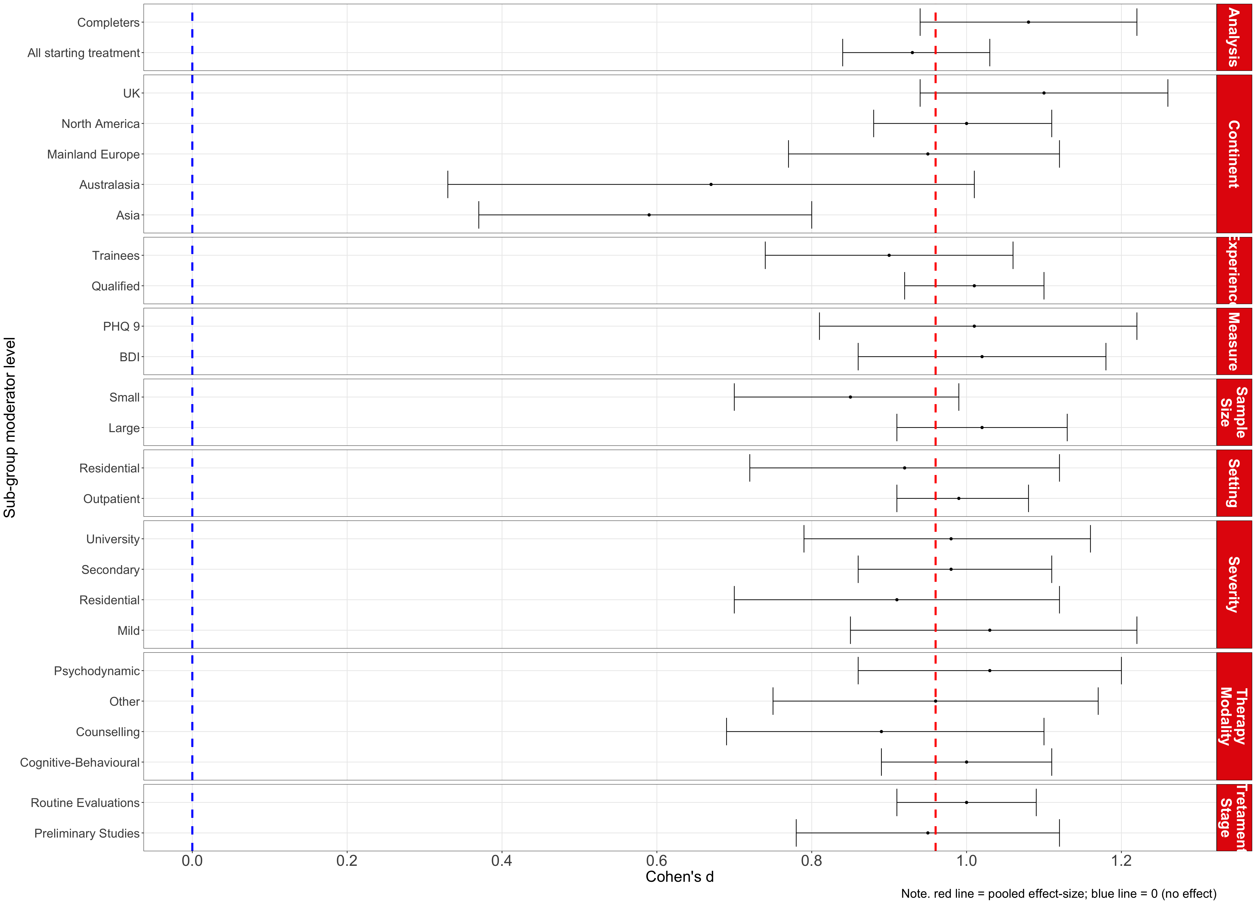 | k = number of studies, d = Cohen's d effect-size, CI = confidence intervals Summary: d = 1.01, k = 153, Tau2 = 0.24[SE = 0.03], I2 = 100%, R2 = 21.44% |